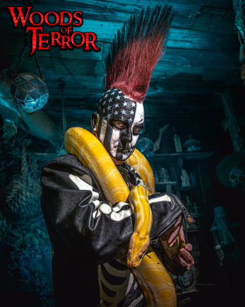 Woods of Terror is one of North Carolina's premier and most terrifying haunted theme park experiences, located in Greensboro on the 45-acre McLaurin Farms. It's a sprawling haunted attraction that features a haunted trail with over a dozen distinct themed horror zones, including haunted houses, creepy tunnels, and other elaborate sets. With a large cast of dedicated actors, professional makeup, detailed sets, and impressive sound and lighting, the experience is designed to challenge visitors' deepest fears, such as clowns, spiders, and claustrophobia. The experience begins in the Monster Midway, a lively waiting area filled with food, fun, merchandise, and roaming monsters. Each night kicks off with the Midway Monster Parade, often led by the operator, Eddie McLaurin (known as "Bone Daddy"), who is frequently accompanied by his large albino Burmese python. Woods of Terror is an actor-driven, non-touch haunted attraction that aims to provide a high-quality, spine-chilling experience that has earned it a reputation as one of America's top haunts.